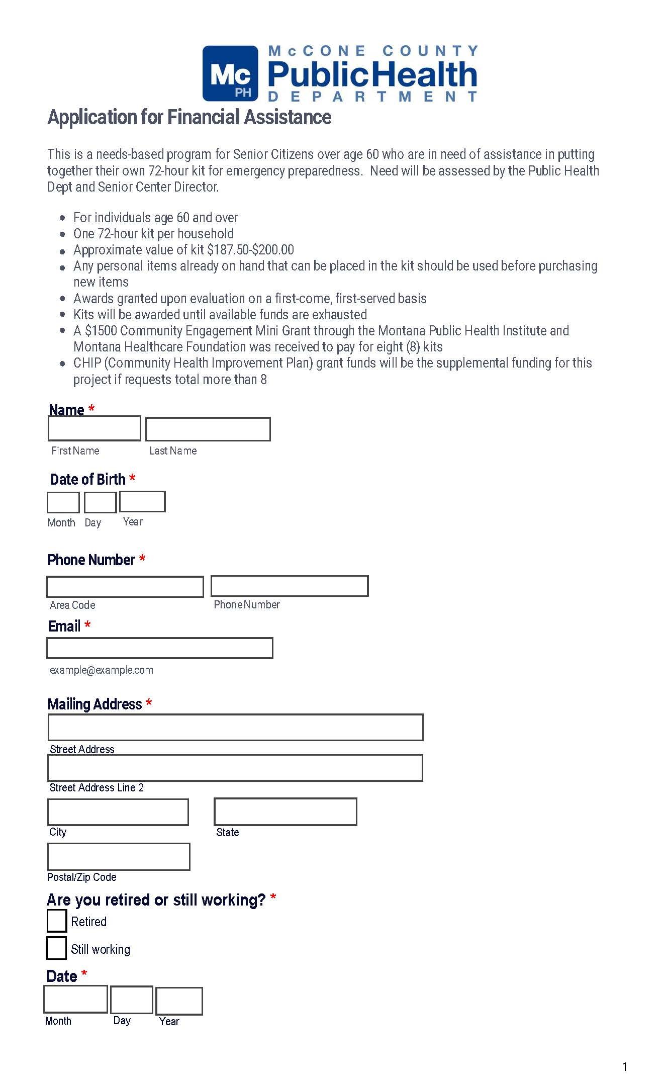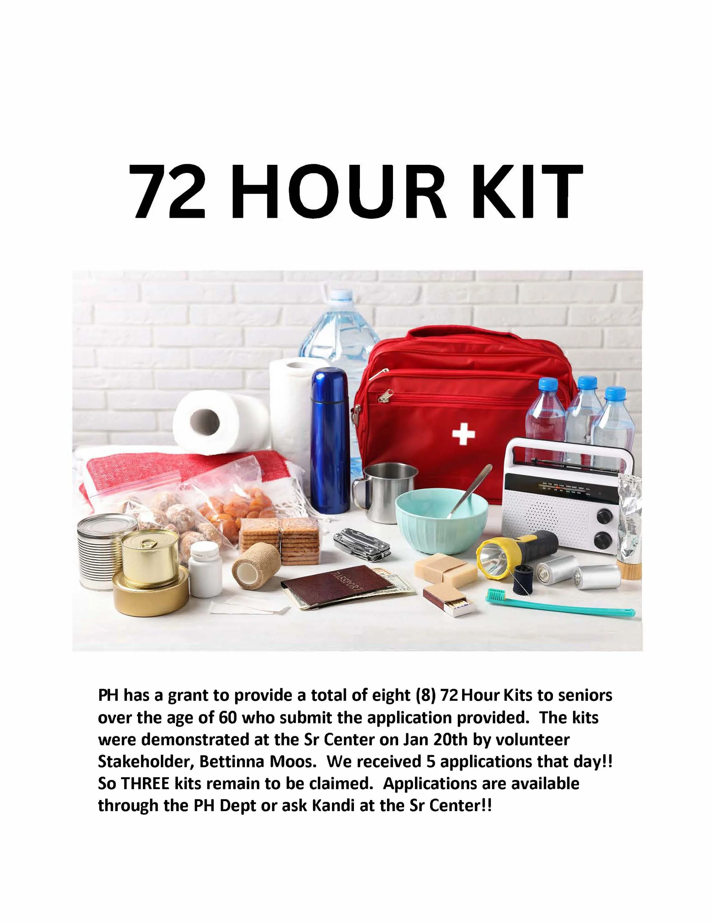 Application for 72 Hour Kit (age 60 and over) limited number available